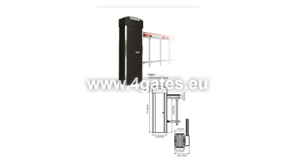 Bürstenloser elektromechanischer Schrankenbaum mit verzinkter Stahlkonstruktion und lackierter Aluminium-Außenhülle für Schrankenbalken bis 5/6 m Länge.